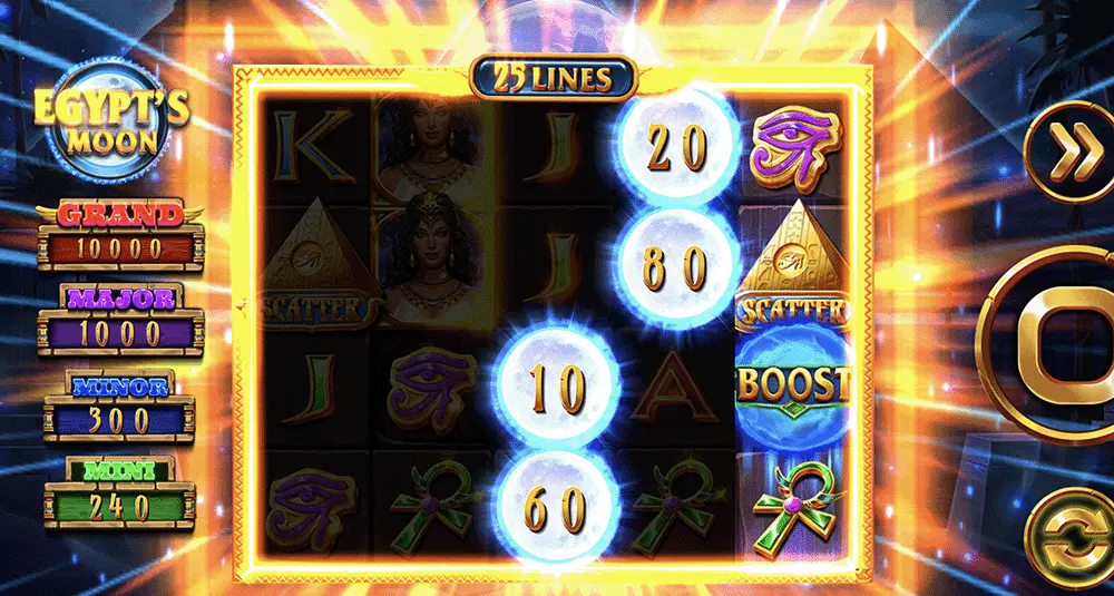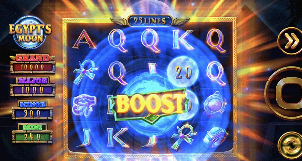 This bonus mode activates either with six bonus symbols or with a combination of five bonus symbols and one Boost symbol. Filling all 20 positions on the grid wins the player the Grand Jackpot.
