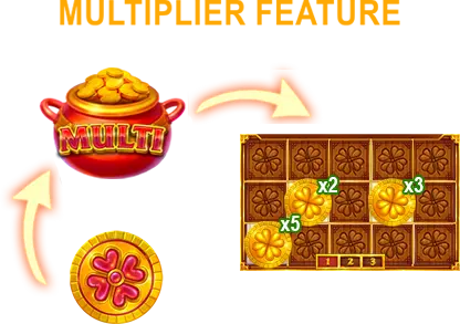 The Multiplier Feature is triggered randomly during the Bonus Game. Each time the Multiplier Feature is triggered, one or more random Bonus symbols may receive a multiplier of x2, x3, or x5. If a multiplier is retriggered on the same Bonus symbol, the multiplier values are multiplied. Multipliers are applied to the value of the Bonus symbols at the end of the Bonus Game.