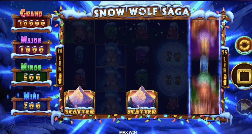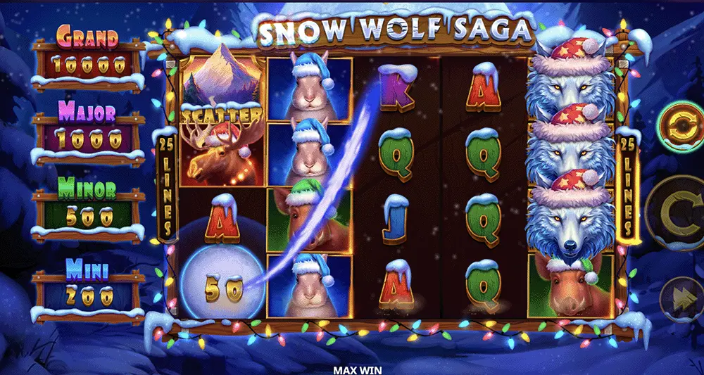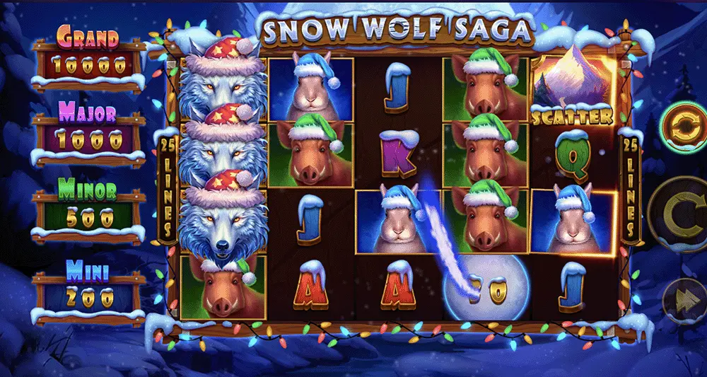 Step into a world of frosty enchantment with Snow Wolf Saga, a captivating slot game set against the backdrop of snow-covered forests and shimmering northern lights. The experience is enhanced with dazzling New Year’s lights, shimmering snow, and vibrant winning lines that light up the screen with every spin, creating a truly magical atmosphere.